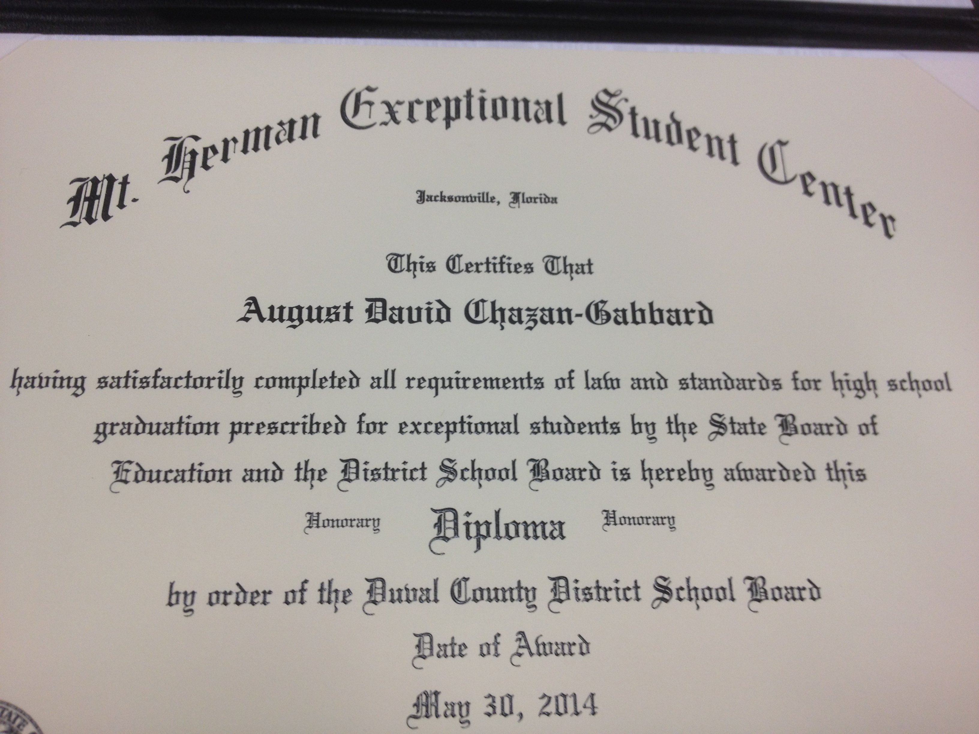 For August’s story, go to A Life Beyond Reason . August was given an honorary diploma at the Mt. Herman graduation ceremony on May 29th, 2014. With Duval County Public Schools superintendent Nikolai Vitti in attendance, Paula Wright, school board member representing district 4, gave Chris Gabbard his son’s diploma. Chris also received this: This video’s […]